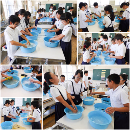 4時間目、家庭科の学習。手洗い洗濯の実習をしていました。今回のターゲットは、「汚れたくつ下」です。