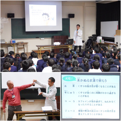 5,6時間目、多目的室で、6年生を対象にくすりの正しい使い方講座が行われました。講師は、学校薬剤師のO先生です。