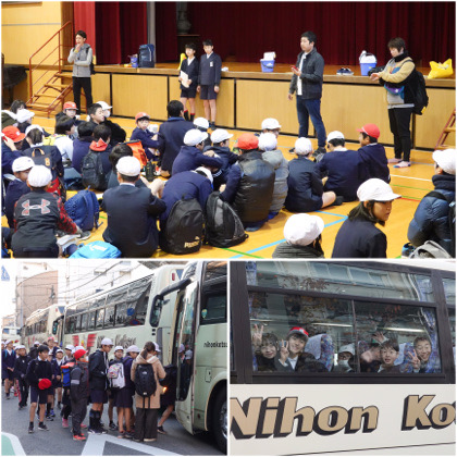 講堂での出発式を終えて、いざ出発! 6年生のみなさん、しっかり見て学んで、そして楽しんできてくださいね。