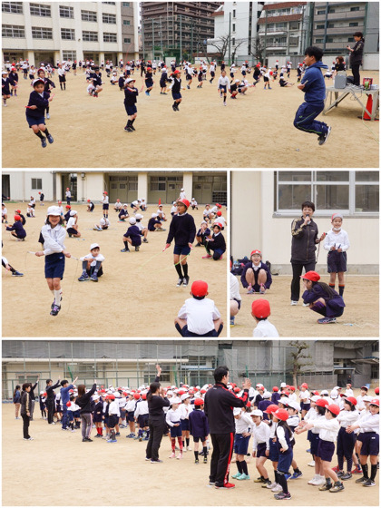 なわとびと鬼ごっこの豪華?2本立て! 縄跳びは、一定時間跳び続けられるかどうかのコンテスト。前回し跳び部門、あや跳び部門などなど。残った子には、Y先生がインタビューする場面もありました。