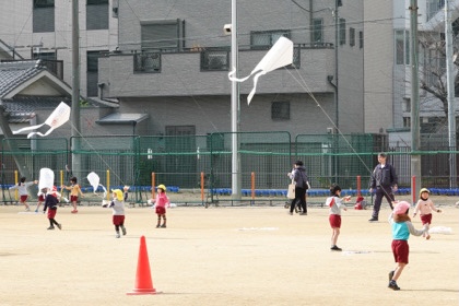 給食時間、常盤幼稚園の子どもたちが、運動場でたこ上げをしました。