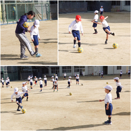 使っているボールは、柔らかい素材のサッカーボール。先生に教わったボールの蹴り方、止め方の練習です。