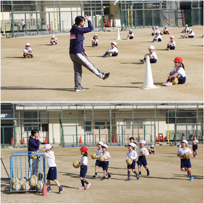 2時間目、体育の学習。2人組でボールけりをしていました。