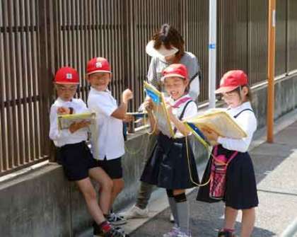 3年生は、社会科「わたしたちの町のようす」で校区についての学習をしています。今日、校区たんけんを行いました。4〜5名でのグループ活動です。