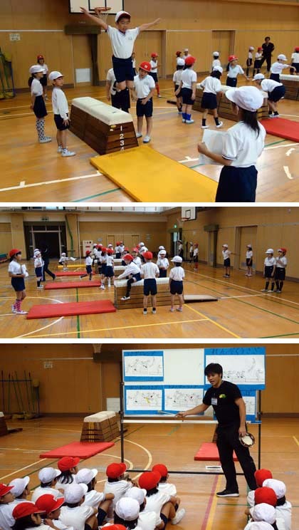 舞台付近では、舞台の高さを使った動きを、フロアでは、とび箱に乗って跳び降りる動きをくり返し練習していました。いずれも「開脚とび」に必要な感覚や動きを身につけるためのものです。