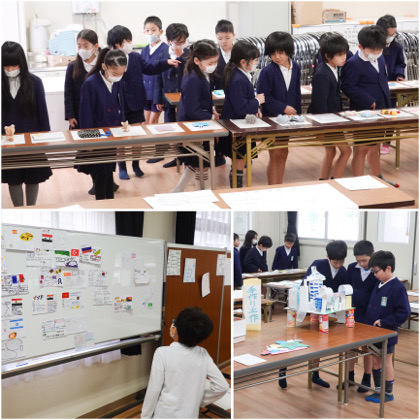 上の写真は、2月26日(水)、3年3組のクラブ作品展示見学の様子です。