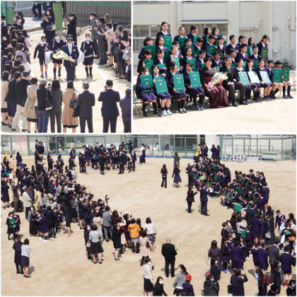 教職員・保護者の皆様に見送られた後、再度運動場に戻ってきて、記念写真を撮りました。2月28日以来、久々の学校で、友だちや先生方と語らいながら、笑顔で写真に収まる6年生。