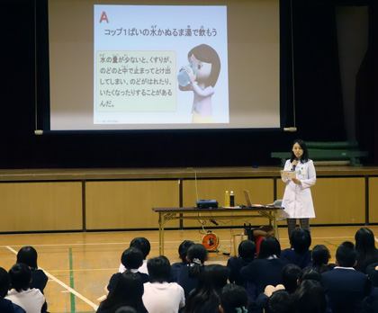 6時間目、講堂で6年生対象の「くすりの正しい使い方講座」が行われました。講師は、学校薬剤師のN先生です。