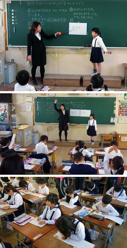 3時間目、算数の学習。「えびが15ひき、かにが7ひきいます。えびはかによりなんびきおおいですか。」という問題が提示されていました。2つの数量の差を求めるひき算ですね。15−7の計算の仕方を考える学習です。