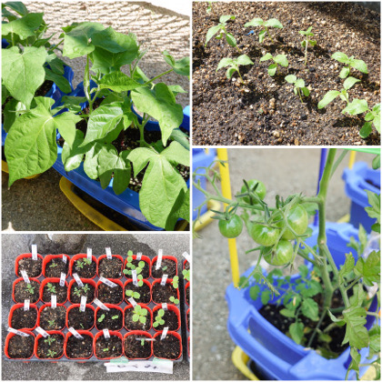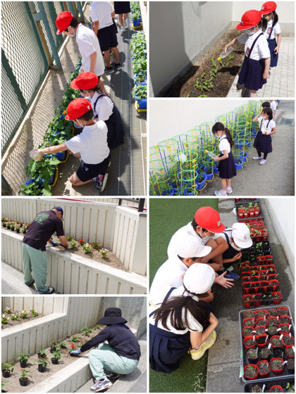 1〜3年生が、草花・野菜を育てています。1年生がアサガオとヒマワリ、2年生がミニトマト、3年生がホウセンカとマリーゴールドです。水やりをしつつ、生長や変化を観察しています。順調に育っているようですよ。