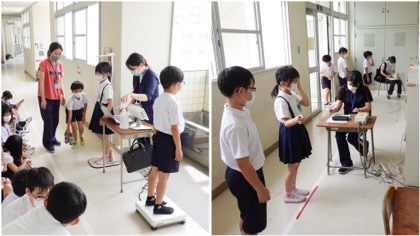 いつもなら保健室で行っていますが、今回は保健室の先生が測定機器を持って各学級教室へ出張。密集・換気の面を考えて、教室前ろうかで行っています。