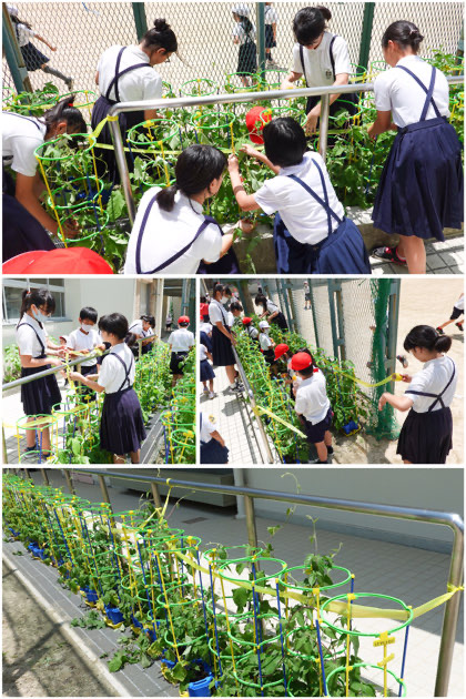 そんなアサガオのところに颯爽と現れたのは、6年1組の子たちです。植木鉢を起こし、外れた支柱を直してくれました。