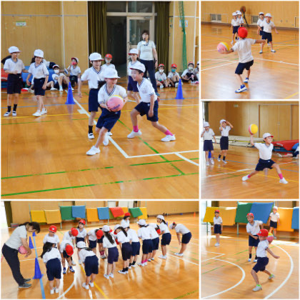 2時間目、講堂でドッジボールをしていたのは、2年1,2組の子どもたちです。