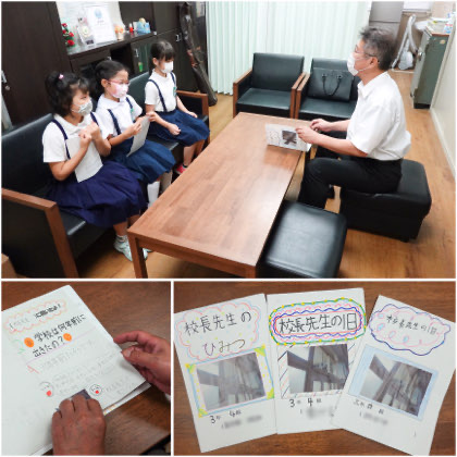 真剣に、ときおり笑顔でレポートを読む校長先生。レポートは、文章に加えて、イラストや写真も入れて上手にまとめられていました。大満足の校長先生、3人とも褒めてもらっていました。やったね!