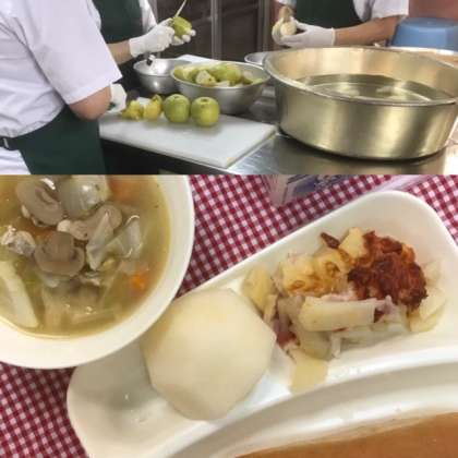 3回水洗いしたあと、調理員さんたちが、包丁で4つに切り分け、皮をむいて芯を取ってくれています。