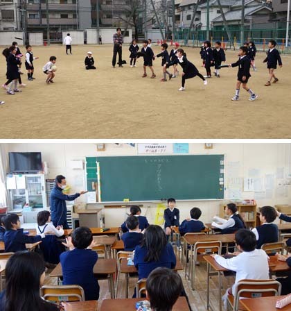 34学級それぞれの締めくくり。ボールとフライングディスクを使ってドッジボールをしていた2年1組。みんなでゲームをしていた5年1組。
