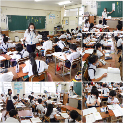 5時間目、国語の学習。文の組み立てと修飾語について学んでいました。
