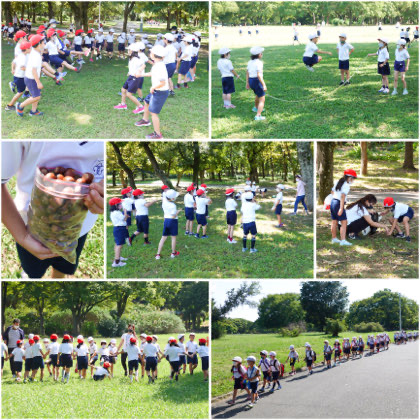 午前中は、わんぱくランド(遊具ゾーン・南広場)で遊びました。遊具ゾーンでは、ジャングルジムやすべり台、ターザンロープなど、たくさんの遊具に大満足! 南広場では、ドッジボールや長なわで、おもいっきり体を動かしました。
