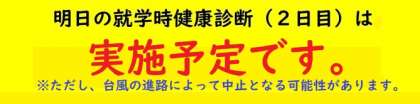 明日10日(土)の就学時健康診断(2日目)は「予定通り実施」とさせていただきます。ただし、台風の進路によっては中止となる可能性もあります。詳しくは下記をご覧ください。