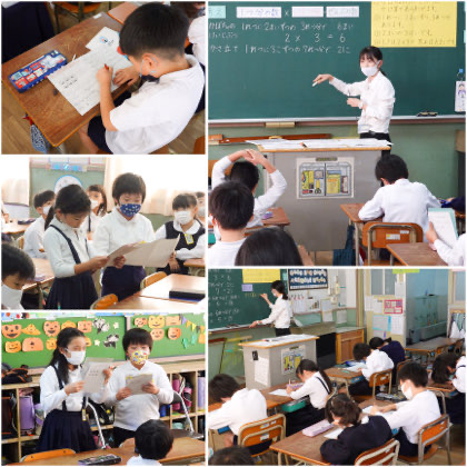 3時間目、算数の学習。「身の回りのかけ算探し」に取り組んでいました。
