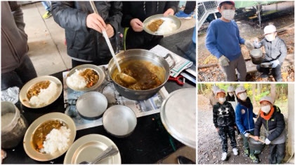 飯ごうと鍋を、かまどからテーブルへ移動。ふたをあけると、食べごろのごはんとカレーがこんにちは!