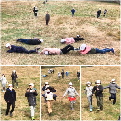 宿舎前の広場で、自由散策を楽しむ子どもたちです。コロコロ転がってる子もいますね。気持ちよさそう!