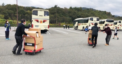 「道の駅 但馬のまほろば」にてトイレ休憩。その時に、お家へのおみやげがバスに積み込まれました。学校に到着後、講堂で子どもたちに渡されます。