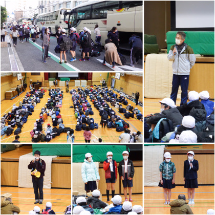 16:30、5台のバスが学校前に到着。そのまま講堂に入って帰校式を行いました。