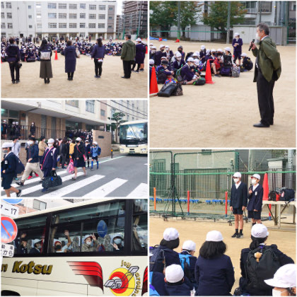 集合時刻は朝早い7:00だったのですが、子どもたちは時間どおりに集合!(保護者の皆様、ご協力ありがとうございました)運動場での出発式後、バス5台で出発です!