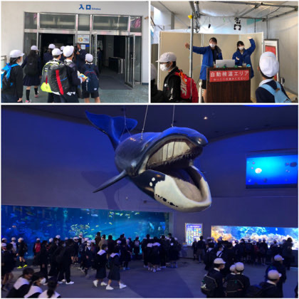 鳥羽水族館につきました。自動検温エリアを通過すると、大きなクジラがこんにちは!