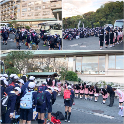 宿舎「扇芳閣(せんぽうかく)」に到着。駐車場で開舎式を行いました。