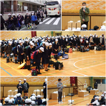 16:55、5台のバスが学校前に到着。そのまま講堂に入って帰校式を行いました。
