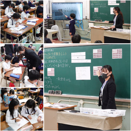 5時間目、算数の学習。「チョコレートの数の求め方」を考えていました。
