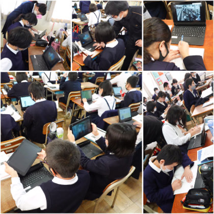 3時間目、理科の学習。先日届いた新型学習用端末(ノートパソコン)を使って、地震や火山活動について調べる子どもたちです。