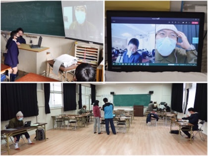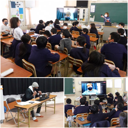 5時間目、関西外語専門学校の4名の留学生とオンラインで交流しました。例年、教室に来ていただいて、直接お話したり活動したりしているのですが、今回は、多目的室(留学生)と教室(5年生)をネットで結んでの交流です。