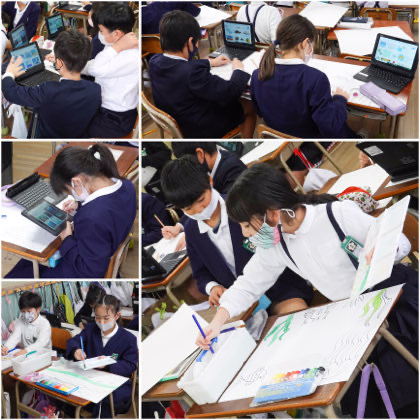 5時間目、図工の学習。紙版画用の絵を描いている子どもたちです。