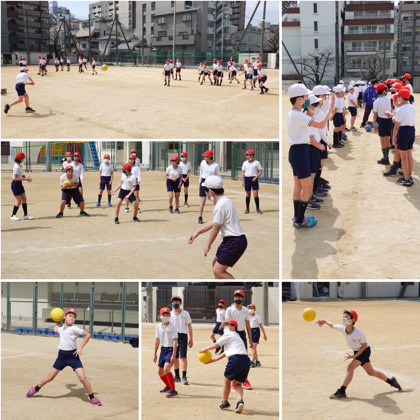 4時間目、体育の学習。5年4組と6年1,2組が合同でドッジボールをしていました。