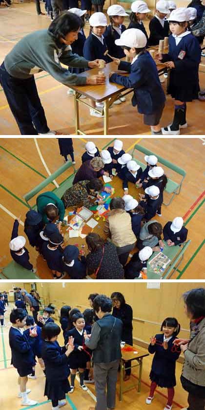 1,2時間目、地域の方に来ていただいて、伝統遊びを教えていただきました。遊びは、コマ回し・メンコ・おりがみ・おはじき・あやとり・けん玉・お手玉・だるま落としの8種類です。