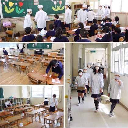 1年生の下校後、1年生の教室とろうかも6年生が掃除してくれています。掃き掃除に拭き掃除、机をきちんと並べなおして…。