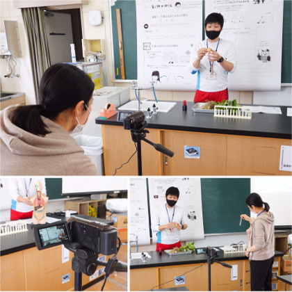 朝の時間の理科室。T先生とN先生が、あわただしく準備をしていました。オンライン学習用の動画撮影の準備とリハーサルです。