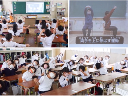 スクリーンに映し出された2人の先生(5年生のK先生と、6年生のA先生)の見本を見ながら、見よう見まねで体を動かす子どもたち。BGMに合わせて、上半身を曲げたり伸ばしたり。