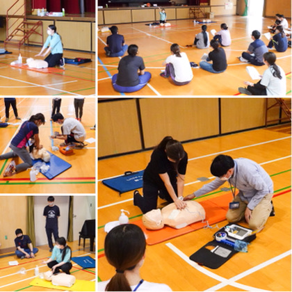 胸骨圧迫(心臓マッサージ)や人工呼吸などの心肺蘇生の手順と、AEDの使い方について学ぶ講習会です。練習用の人形とAEDを使って実際に訓練しました。