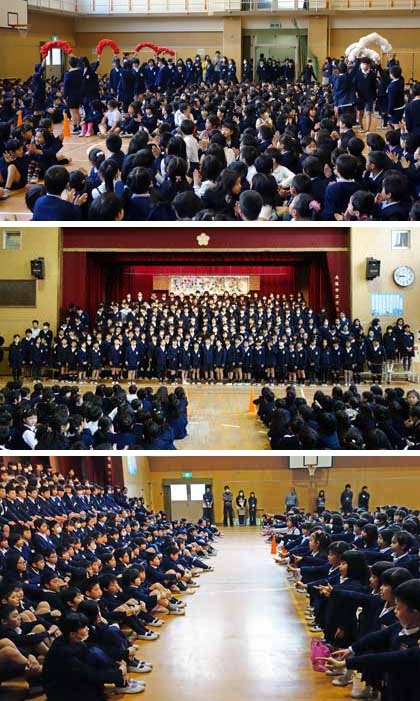 続いて、プレゼントの交換。在校生からは、たてわり班のメンバーが書いたメッセージカードが、卒業生からは手作りのぞうきんがプレゼントされました。最後は100周年記念歌「We Love ときわ」を全員で歌って、お別れ会を締めくくりました。