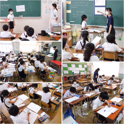 3時間目、1,3,5組の子どもたちが、それぞれの学級教室+3年学習室で、「何人に分けられるのか」を求める問題に取り組んでいました。