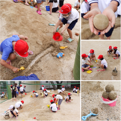 山を作ったり、溝を掘って水を流したり、泥だんごを作ったり。スコップやバケツを片手に大忙し!