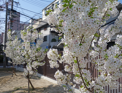 本日から平成27年度がスタート。写真は、昨年6月に植樹した3本の桜の木です。小さいながらも、しっかりと花を咲かせています。