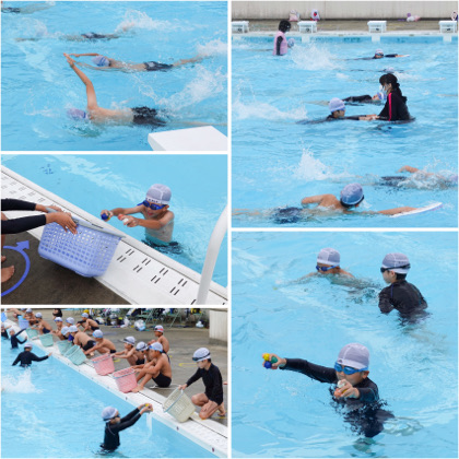 けのび、バタ足、クロールでひと泳ぎした後、宝さがしやリレーをして楽しみました。