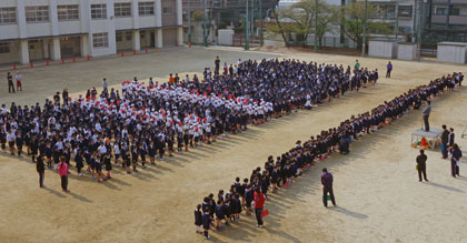 2〜6年生が拍手で待ちうける中、となりの子と手をつないで入場してきた1年生。今年の1年生は191名で、6クラスあります。