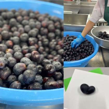 調理員さんが、きれいに洗った巨峰をクラスごとに数を数えてボールに分けていきます。