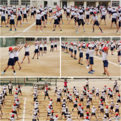 ペットボトルを打ち鳴らす音が響く運動場。音と動きがピタリそろったら、カッコいいこと間違いなしです!